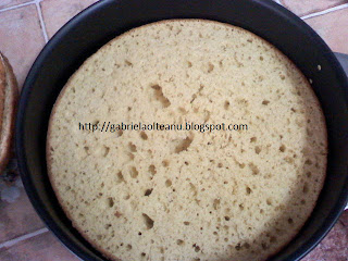 Blatul l-am facut dupa reteta clasica.Am batut galbenusurile cu zaharul iar albusurile cu praful de sare.Am adaugat faina amestecata cu praful de copt in ploaie.Am copt aproximativ 30 minute la foc mic.